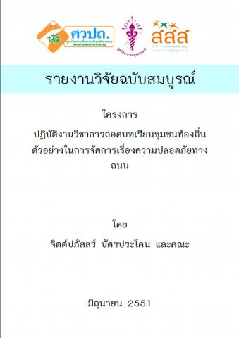 โครงการปฏิบัติงานวิชาการถอดบทเรียนชุมชนท้องถิ่นตัวอย่างในการจัดการเรื่องความปลอดภัยทางถนน ได้ทำการถอดบทเรียนอปท.และชุมชนซึ่งชนะเลิศการประกวดโครงการชุมชน ร่วมใจ สร้างความปลอดภัยทางถนนของสภาวิศวกร ประจำปี 2549 ได้แก่