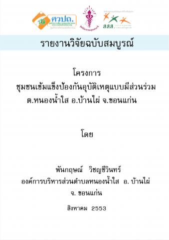 โครงการชุมชนเข้มแข็งป้องกันอุบัติเหตุแบบมีส่วนร่วม ต.หนองน้ำใส อ.บ้านไผ่ จ.ขอนแก่น มีวัตถุประสงค์เพื่อให้ชุมชนได้มีโอกาสแสดงความคิดเห็น สามารถกำหนดแนวทางของชุมชนเองได้ เพื่อให้ชุมชนมีความรู้ความเข้าใจเรื่องอุบัติเหตุอย่างแท้จริง สามารถปฎิบัติตามกฎประชาคมได้อย่างสอดคล้องลงตัว เพื่อพัฒนาบุคลากรในศูนย์ อปพร. ให้เกิดความเข้มแข็งทั้งด้านการปฎิบัติหน้าที่และการบริหารจัดการกองทุน และเพื่อนำข้อมูลที่ได้จากการศึกษาวิเคราะห์ไปนำเสนอเพื่อนำไปใช้ในการแก้ปัญหาอุบัติเหตุจราจรของอำเภอบ้านไผ่อย่างเป็นระบบ โดยการดำเนินงานเน้นใช้มติประชาคมเพื่อให้ประชาชนยอมรับและปฏิบัติตาม ภายใต้หลักหลักคิด ความปลอดภัยนี้ของชุมชน โดยชุมชนและเพื่อชุมชน