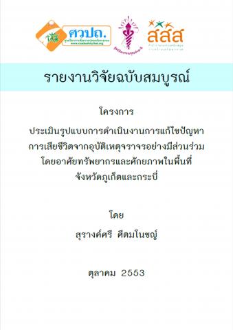 โครงการประเมินรูปแบบการดำเนินงานการแก้ไขปัญหาการเสียชีวิตจากอุบัติเหตุจราจรอย่างมีส่วนร่วมโดยอาศัยทรัพยากรและศักยภาพในพื้นที่จังหวัดภูเก็ตและกระบี่ มีวัตถุประสงค์เพื่อประเมินรูปแบบการดำเนินงานการแก้ไขปัญหาการเสียชีวิตจากอุบัติเหตุจราจรอย่างมีส่วนร่วมโดยอาศัยทรัพยากรและศักยภาพในพื้นที่ ในจังหวัดภูเก็ต และกระบี่ ในด้านบริบท (Context) ปัจจัยนำเข้า (Input) กระบวนการ (Process) และผลผลิต (Product) โดยพบว่าการใช้ข้อมูลจากการวิเคราะห์สาเหตุการตายของผู้เสียชีวิตจากอุบัติเหตุจราจรสามารถเป็นจุดเริ่มต้นหรือกระตุ้นให้หน่วยงานที่เข้าร่วมโครงการฯให้เห็นความสำคัญของการเก็บรวบรวม วิเคราะห์และใช้ข้อมูลที่นำไปสู่การแก้ไขปัญหาอุบัติเหตุจราจรได้ โดยปัจจัยแห่งความสำเร็จคือ ผู้ประสานงานหลักที่ต้องมีความต่อเนื่อง มีบทบาทหน้าที่ด้านบริหาร มีงบประมาณเพื่อการบริหารจัดการ เน้นการใช้รูปแบบไม่เป็นทางการและข้อมูลวิชาการ เชื่อมภาคีทุกระดับ และชุมชนเข้ามามีส่วนร่วม