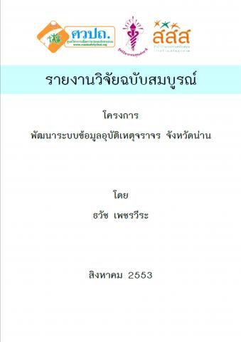 โครงการพัฒนาระบบข้อมูลอุบัติเหตุจราจร จังหวัดน่าน โดยแต่งตั้งจากเจ้าหน้าที่ผู้ปฏิบัติงานด้านการป้องกันและลดอุบัติเหตุทางถนนของหน่วยงานเครือข่ายในการบูรณาการป้องกันและลดอุบัติเหตุทางถนน ในระดับจังหวัด เพื่อทำหน้าที่ในการบูรณาการจัดเก็บข้อมูลการเสียชีวิตจากการเกิดอุบัติเหตุทางถนน ตั้งแต่วันที่ 1 พฤศจิกายน 2552 ถึงวันที่ 31 กรกฎาคม 2553 จำนวน 9 เดือน ๆ ละ 3 ราย หรือรายที่น่าสนใจ รวม 27 ราย โดยจัดเก็บข้อมูล ศึกษาปัญหา สาเหตุและปัจจัยของการเสียชีวิตจากการเกิดอุบัติเหตุจราจรในเชิงลึกครอบคลุมทั้งพื้นที่ในจังหวัดน่าน และนำข้อมูลที่ได้จากการจัดเก็บมาศึกษาวิเคราะห์สรุป และนำเสนอสภาพปัญหาและข้อเสนอแนะให้ผู้บริหารศูนย์อำนวยการความปลอดภัยทางถนนจังหวัดน่านทราบ เพื่อพิจารณานำข้อมูลไปใช้ในการกำหนดมาตรการแนวทางในการแก้ไขปัญหาอุบัติเหตุจราจรของจังหวัดน่านอย่างเป็นระบบต่อไป