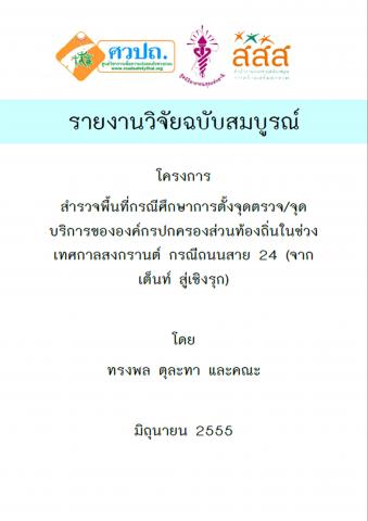 ในช่วงเทศกาลที่มีวันหยุดติดต่อกันหลายวัน ทำให้มีปริมาณการใช้รถใช้ถนนเพิ่มสูงขึ้นและเป็นเหตุให้เกิดอุบัติเหตุจำนวนมาก ศูนย์วิชาการเพื่อความปลอดภัยทางถนนจึงได้สนับสนุนโครงการสำรวจพื้นที่กรณีศึกษาการตั้งจุดตรวจ/จุดบริการขององค์กรปกครองส่วนท้องถิ่นในช่วงเทศกาลสงกรานต์ กรณีถนนสาย 24 (จากเต็นท์ สู่เชิงรุก) ครอบคลุมพื้นที่ 5 จังหวัด ได้แก่ จ.นครราชสีมา จ.บุรีรัมย์ จ.ศรีสะเกษ จ.อุบลราชธานี และ จ.สุรินทร์ ดำเนินการใน 17 อำเภอ 73 ตำบล เพื่อศึกษากระบวนการในการป้องกันการเกิดอุบัติเหตุทางถนนขององค์กรปกครองส่วนท้องถิ่น ศึกษาผลสัมฤทธิ์ของกระบวนการในการป้องกันการเกิดอุบัติเหตุทางถนนขององค์กรปกครองส่วนท้องถิ่นในช่วงเทศกาลสงกรานต์ และเพื่อศึกษาการใช้งบประมาณในการทำกิจกรรมที่เกี่ยวกับความปลอดภัยทางถนนขององค์กรปกครองส่วนท้องถิ่นในพื้นที่กรณีศึกษาตำบลบนถนนสาย 24