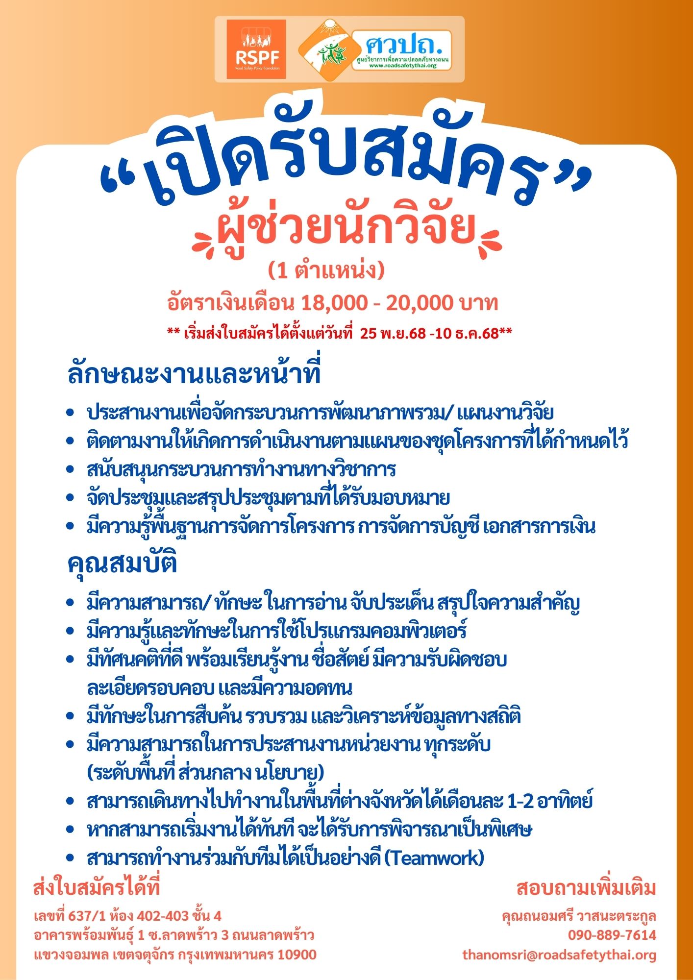 #สมัครงาน2568 #ผู้ช่วยนักวิจัย #นักวิชาการ #นักวิจัย #ศูนย์วิชาการเพื่อความปลอดภัยทางถนน #งาน